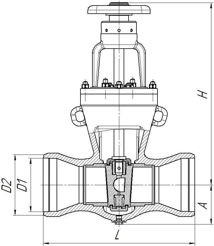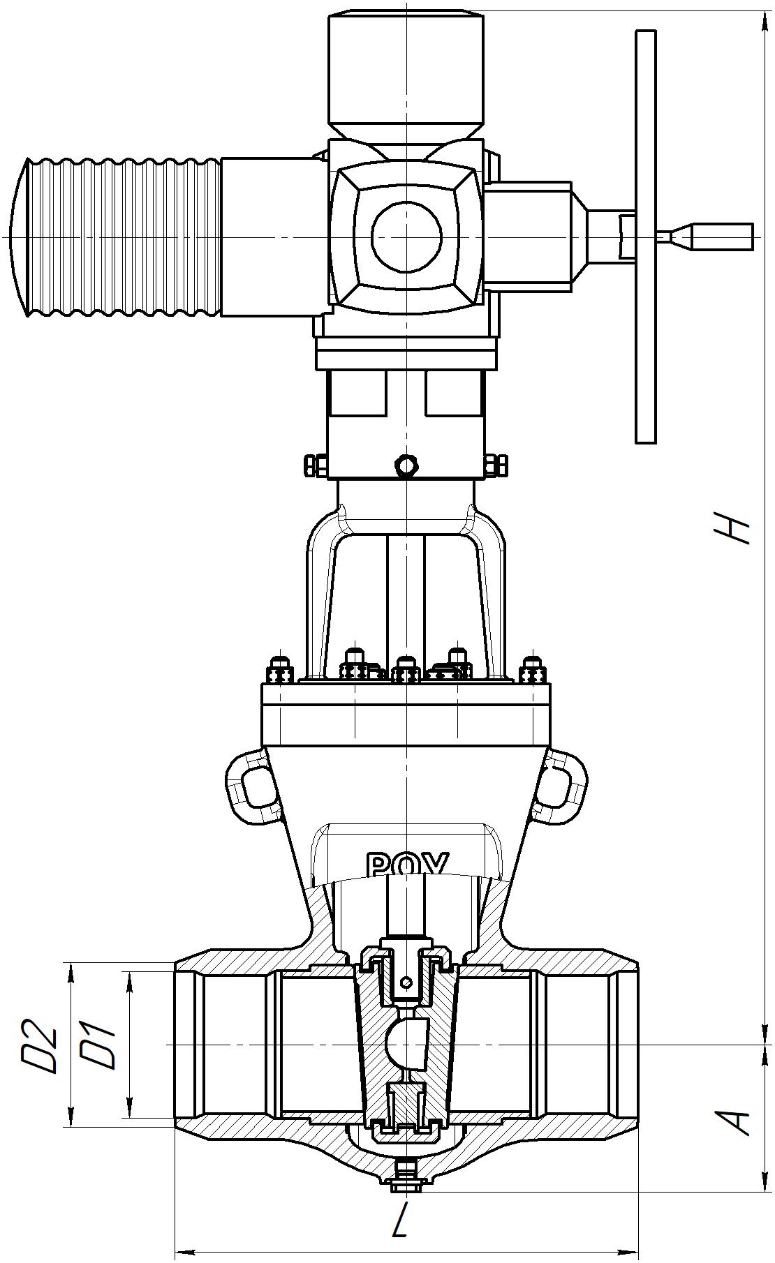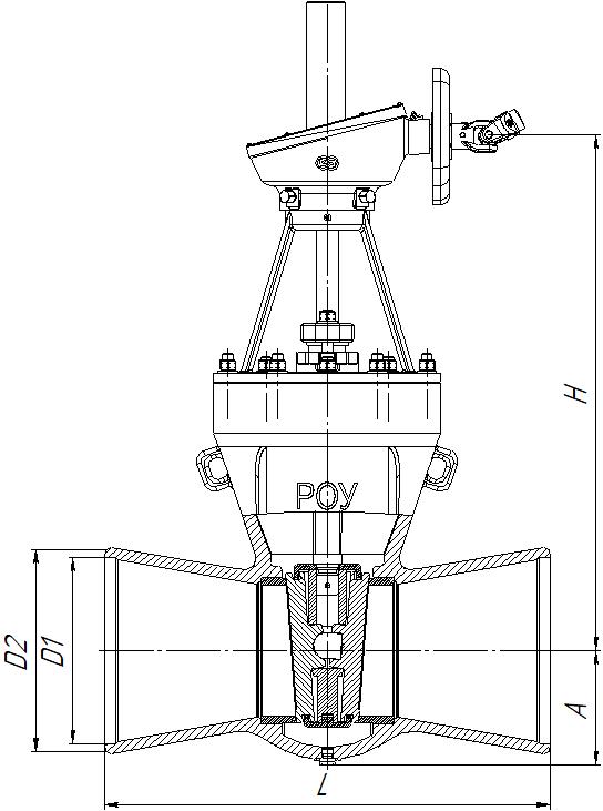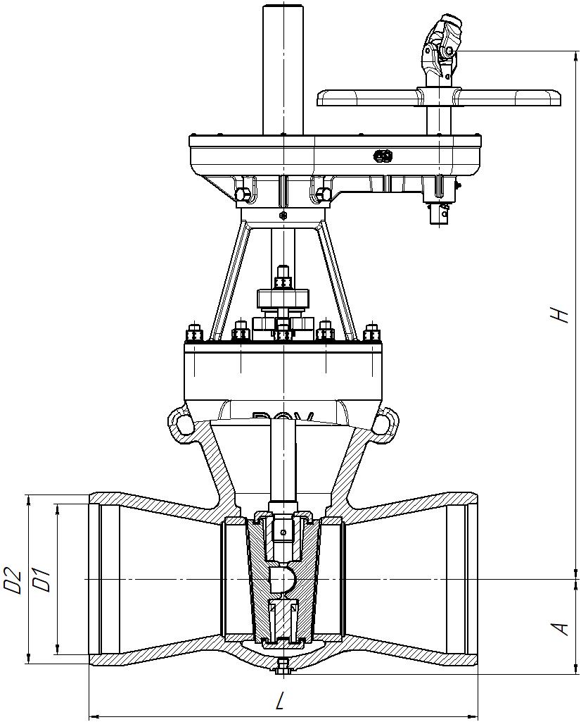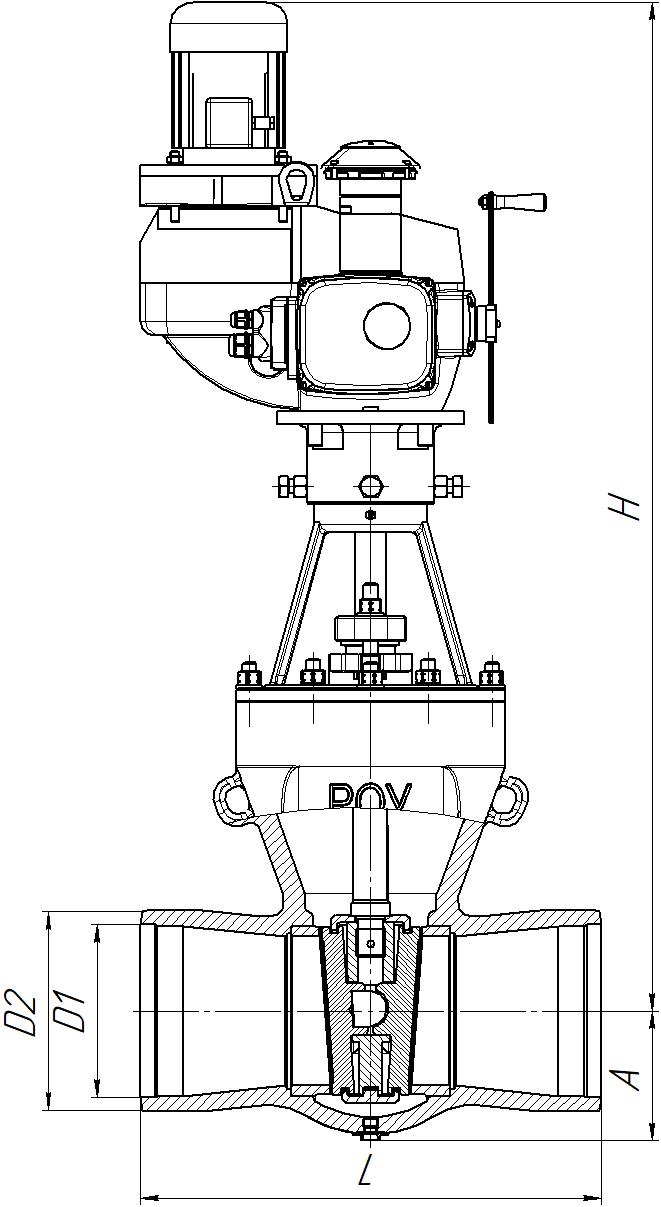 | Обозначение изделия | DN, мм | Рабочая среда | Материал корпуса | Кол-во оборотов | Рабочий ход, мм | Способ управления | D1, мм | D2, мм | L, мм | H, мм | А, мм | Полная масса, кг | Привод | Мощность привода, кВт | Время полного хода, сек | Масса без привода, кг |