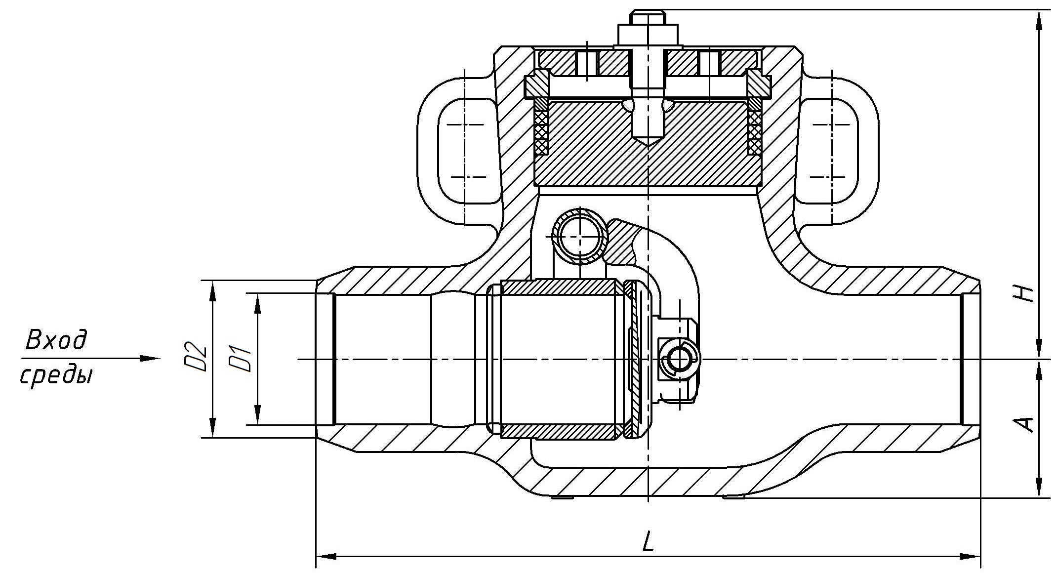 Принцип работы: в рабочем состоянии под воздействием потока рабочей среды затвор обратный открыт, при отсутствии движения рабочей среды или при действии потока в обратном направлении затвор закрывается.